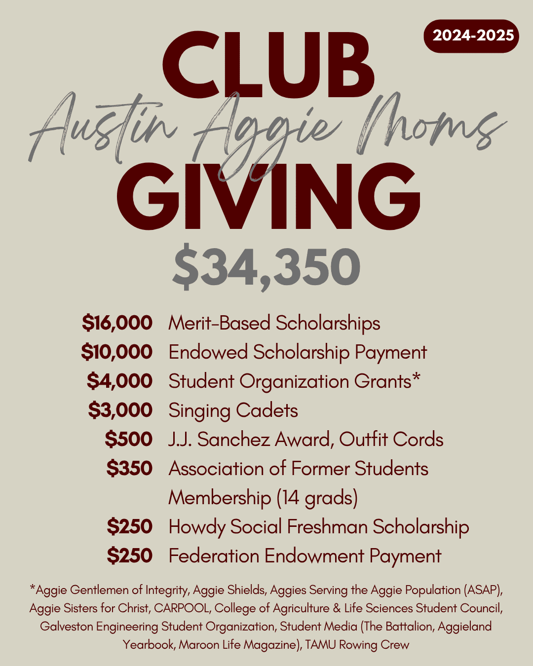 Check back on February 1, 2026 for 2026-2027 scholarship applications. In 2025, we awarded $16,000 in merit scholarships. WHOOP! Late applications will not be considered. Questions? Email austinaggiescholarships@ aggiemoms.org.